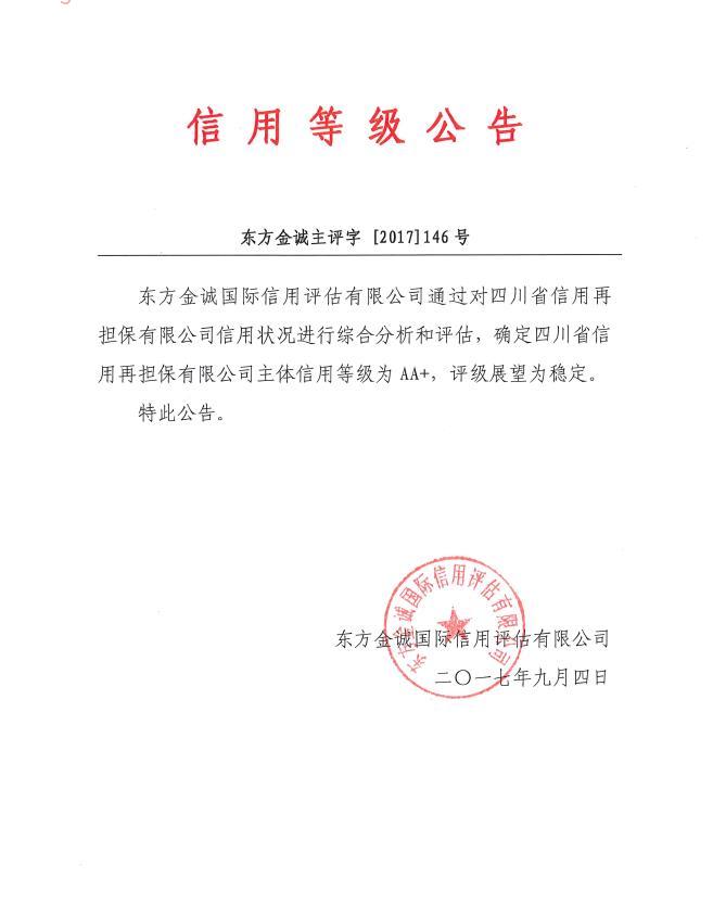9月4日,东方金诚国际信用评估有限公司出具了《四川省信用再担保有限公司2017年主体信用评级报告》,将四川省信用再担保有限公司(以下简称公司)的主体信用等级评定为AA+级,评级展望为稳定。