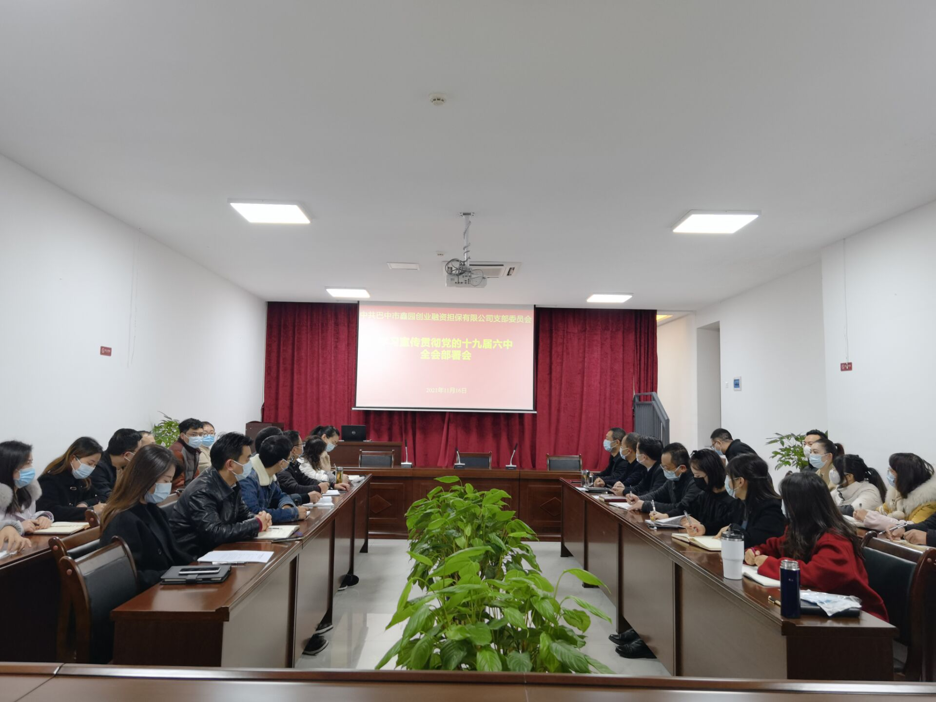 11月16日上午,市鑫园创业融资担保有限公司党支部组织公司全体职工召开了专题学习会,传达学习党的十九届六中全会精神,党支部书记余斌主持会议。