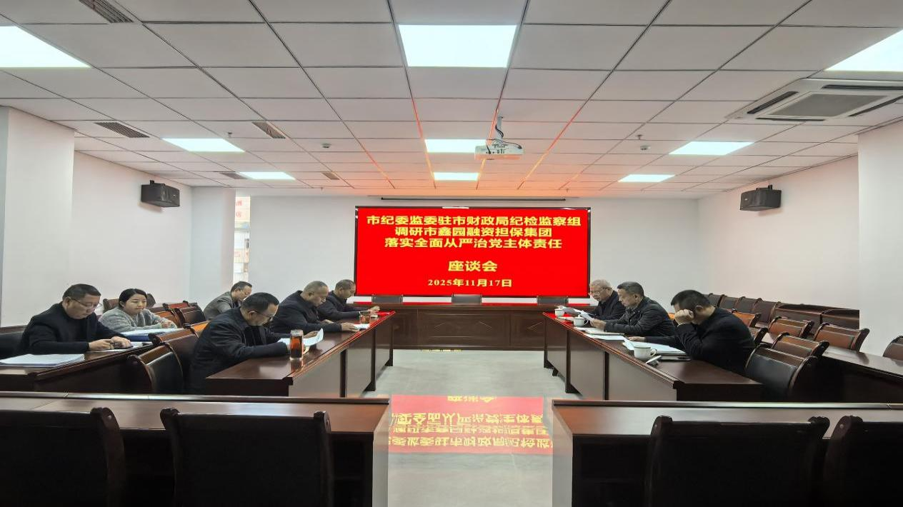 2025年11月17日,市纪委监委驻市财政局纪检监察组赴市鑫园融资担保公司开展落实全面从严治党主体责任情况调研活动。调研组一行查阅相关资料、了解公司党建工作开展情况,并召开座谈会听取公司落实全面从严治党主体责任情况汇报。
